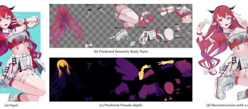 この課題に対し、今回発表された技術「See-through」は、1枚のアニメイラストから動かせる状態のレイヤー分解を自動で行う画期的なフレームワークです。具体的には、入力画像を髪、目、腕など19種類のパーツに自動分離してRGBAレイヤーとして出力し、前髪の裏の額や服の下の体といった隠れた部分をAIが補完します。さらに、パーツの重なり順を疑似深度マップとして推定し、髪が顔を前後から挟むような複雑な前後関係にも対応できるのが特徴です。