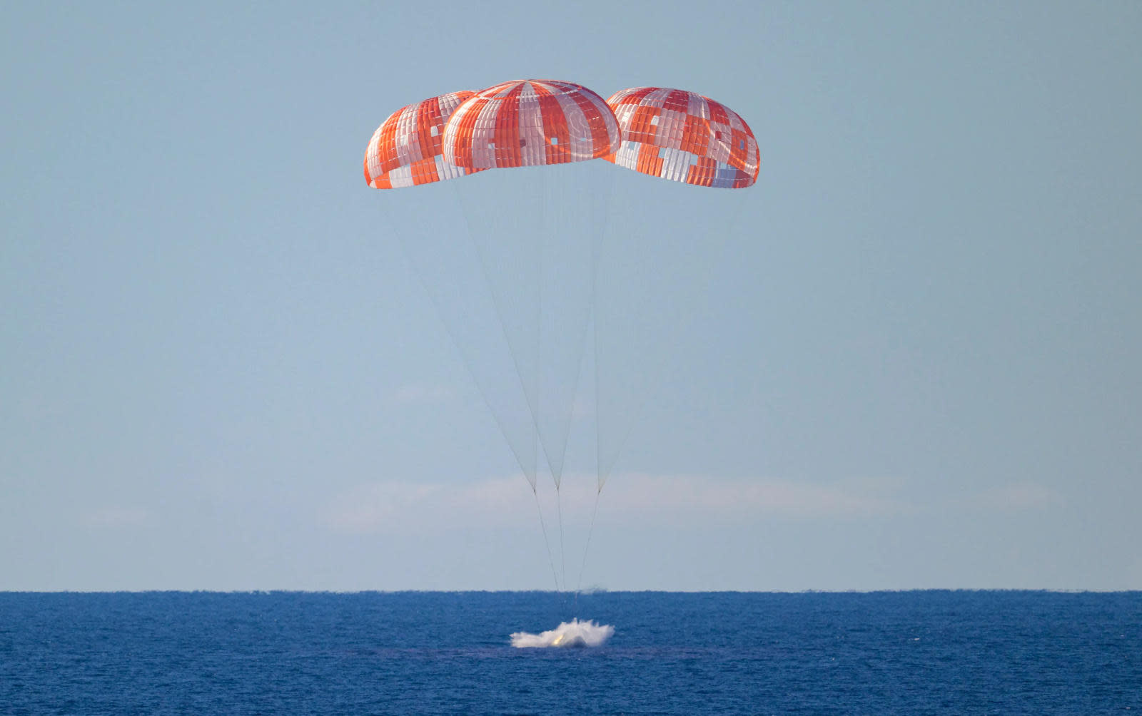 その後、オリオンは誘導降下を開始し、高度23,400フィート(約7,132メートル)でドラッグシュートを展開して機体を安定させ、減速しました。さらに高度5,400フィート(約1,646メートル)でドラッグシュートを切り離し、3つのメインパラシュートを展開。これにより、カプセルの降下速度は毎秒200フィート(約61メートル)まで減速され、安全な着水を実現しました。着水後、NASAのエンジニアはカプセルが水上にある間に複数のテストを実施。その後、回収チームがインフレータブルボートでカプセルに接近し、午後9時34分までに4名の宇宙飛行士全員を無事救出しました。宇宙飛行士たちはヘリコプターでUSSジョン・P・マーサドック型輸送揚陸艦に移送され、医師による健康診断を受けました。
